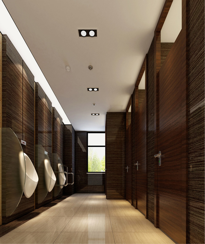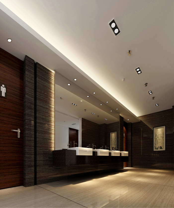 卫生间洗手台正面的机刨石和茶镜材质,与公共卫生间的材质一致,凹进去的墙面则用机刨石饰面,前面装饰竹子,白色防水石膏板顶面、黑色石材墙面、浅灰色防滑地砖、重色木质门体,使整个空间设计不失细节。