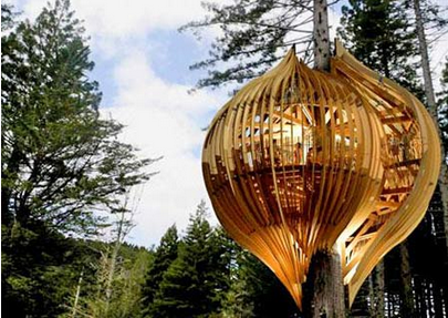 2.新西兰太平洋环境公司的建筑师们设计的黄*树屋餐厅,位于一片红树林上。看上去像是一个镶在40米高的红杉树上的巨大蚕蛹,主体为人工种植的白杨木条,栏杆用附近的红衫木做成,充分利用了自然采光。