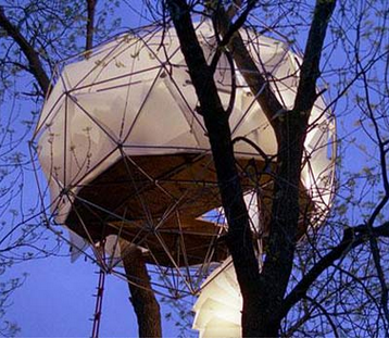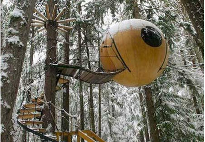 3.自由精神生态球由加拿大的Tom Chudleigh设计。外观好似挂在树梢的垂饰。球体由玻璃纤维和当地的木材手工做成可以接电照明和采暖。网状支撑系统可以保证球体的稳定。通过环绕树干的旋转楼梯可以进入球体。