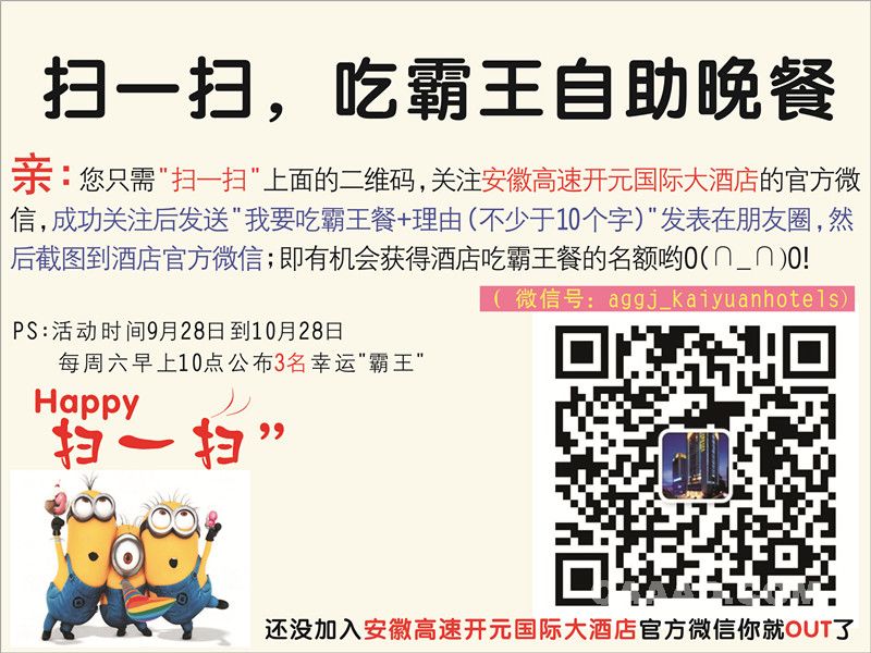 1、关注安徽高速开元国际大酒店公众微信(微信号:aggj_kaiyuanhotels);