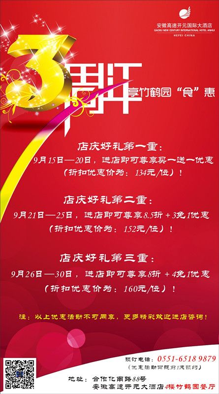 为感谢宾客三年以来对竹鹤园日本餐厅的支持与厚爱,安徽高速开元国际大酒店四楼的竹鹤园日本餐厅特别推出“庆三周年店庆 享竹鹤园“食”惠”系列店庆活动。