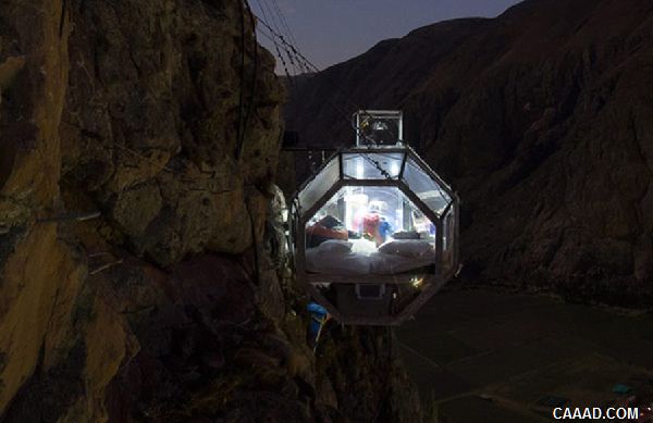 据中国酒店设计网报道,近日,秘鲁一家名叫自然天际的酒店别出心裁得建在了悬崖边上,该酒店包括三间胶囊型玻璃房,通过绳索悬挂在半空,共能容纳8人。想要住在这家酒店可不容易,房客需要先乘索道,再经过一番攀爬,达到120米高的玻璃房,因此有国外媒体将其称为世界最刺激的酒店。