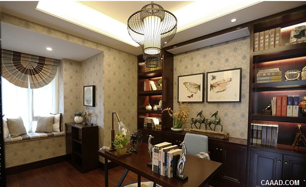 中式叠排的地下室,往往作为才艺空间进行设计,比如书房加上罗汉床的设计,整体的文化气息马上就散发出来。如果房子的业主喜欢书法、喜欢阅读,那么完全可以在这个空间里面得到满足,同时也是一种品位的体现。